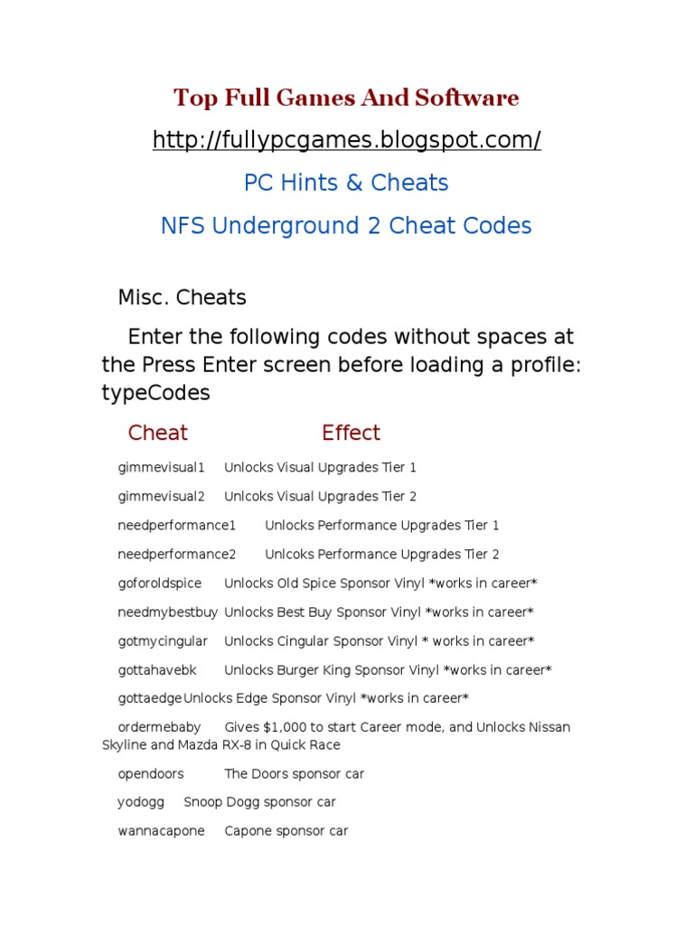 Underground 2 cheats, codes, unlockables, hints, easter eggs, glitches, tips, tricks, hacks, downloads, achievements, guides, faqs, walkthroughs, and more for pc (pc) need for speed underground cheat pc. Need for speed underground 2 cheatsadded 10 mar 2005, id #5962.